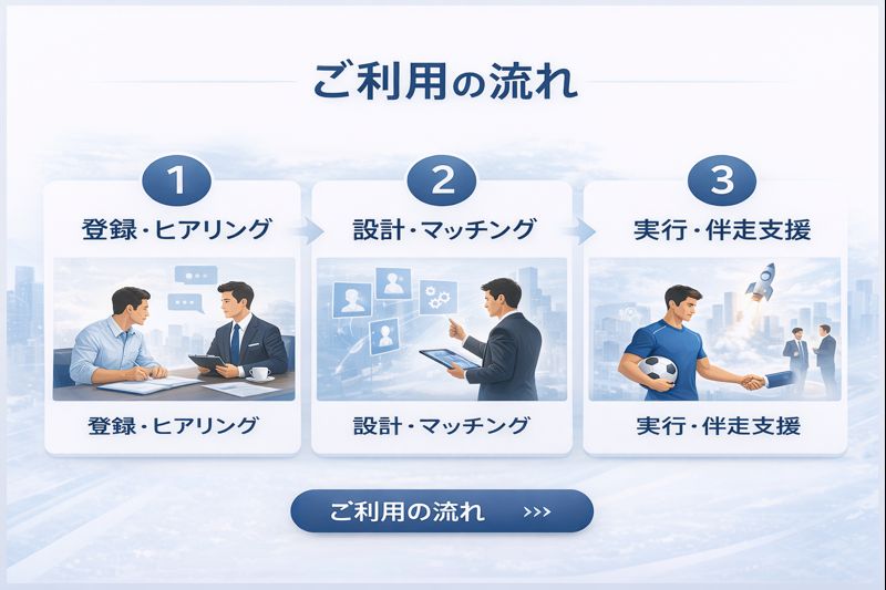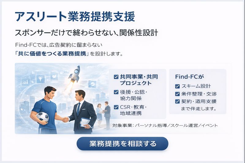 Find-FCは、採用・業務提携・共同プロジェクトまで、目的に応じた最適な形を設計し、実行まで伴走します。